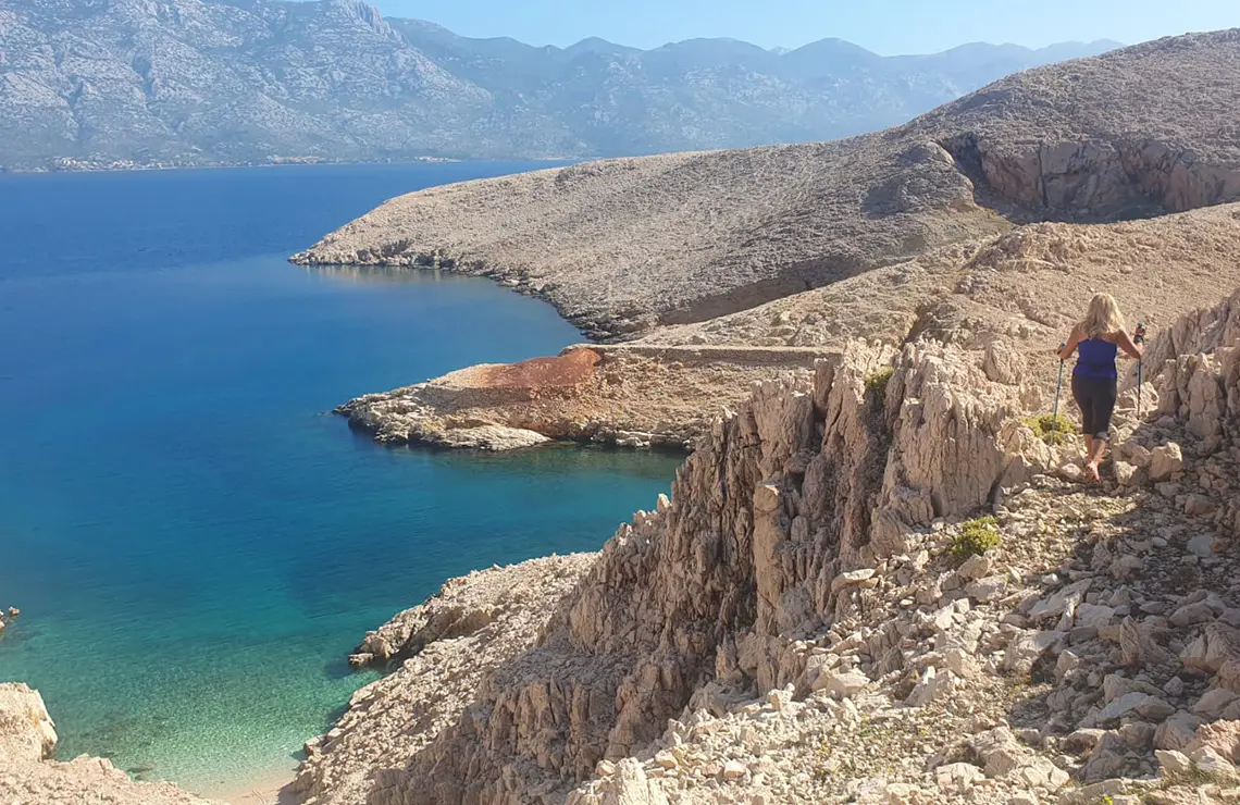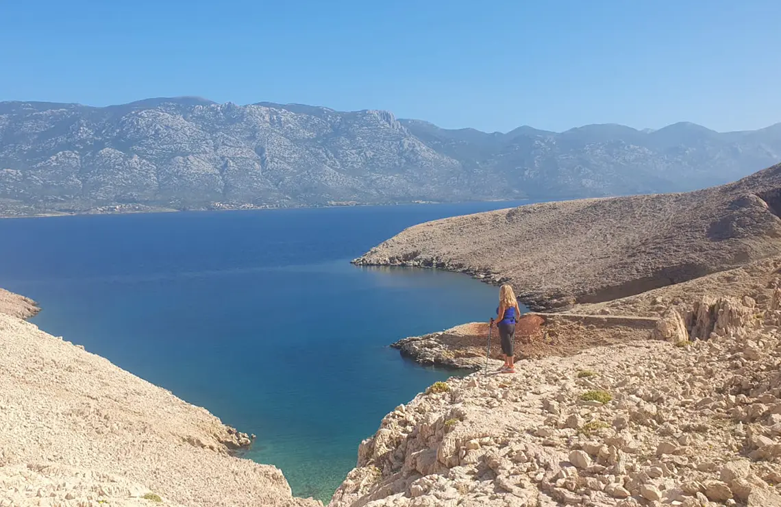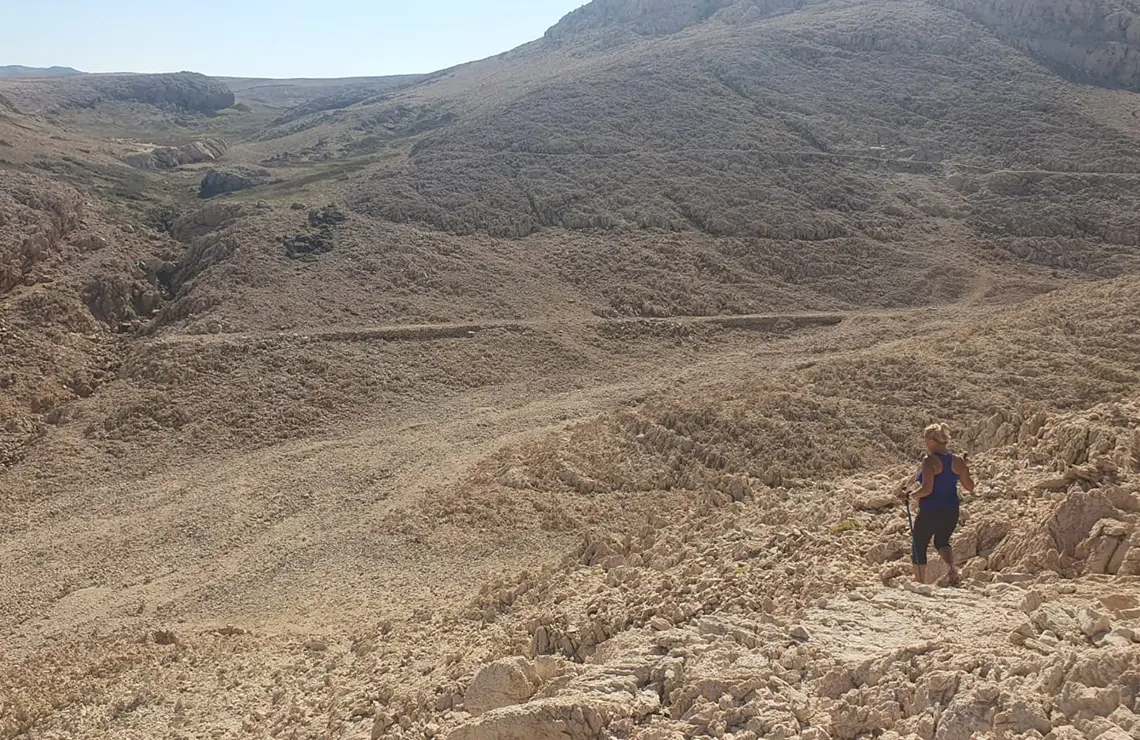 Once off the asphalt, the trail for the next 6 km (all the way to Vela Luka Bay) runs entirely along the coast at elevations varying between 100 m and 200 m above sea level. It meanders through diverse rocky structures, crosses several valleys, and ascends to several “galleries” offering impressive views of almost the entire length of Velebit. The most stunning part comes just before descending into Vela Luka Bay, where you'll find yourself at the last gallery, feeling like a character in “The Lord of the Rings”. This section of the trail, with its frequent short ascents and descents, is moderately demanding and includes several technically challenging spots where caution is needed. Proper trail or hiking footwear for rugged terrain is a must, as well as having at least 1.5 litres of water on hand and wearing a hat, as the Life on Mars trails offer no shade whatsoever! The trail is largely runnable and ideal for active athletes and recreational users as well as guided groups, which can be arranged through the local DMC travel agency Sunturist Novalja.